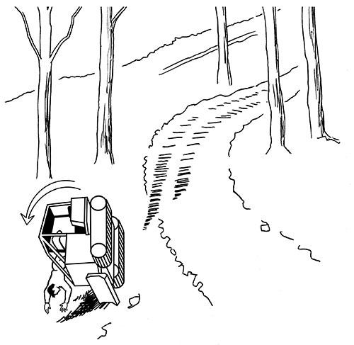 • Operators should use extra caution when using heavy equipment on steep terrain—keeping the tracks positioned straight up and down the slope—and should not operate bulldozers where hazards such as frozen ground, stone outcroppings, or loose rock would cause the dozer to lose stability on hilly terrain.