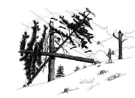 ACCIDENT: The falling tree struck the branches of the dead pine tree and knocked the lodged tree loose. The now dislodged pine fell uphill toward the logging employee.