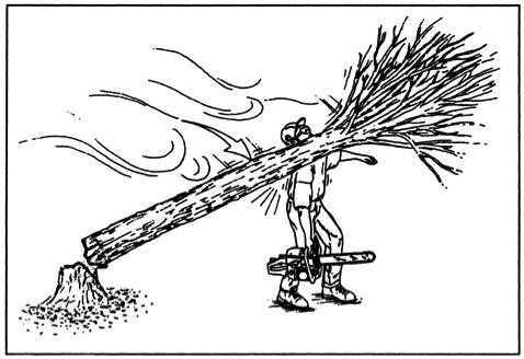 ACCIDENT: The shifting high winds started to force the tree in the direction opposite to that of the intended fall. The remaining wood broke unexpectedly, and the tree fell, striking the sawyer on the shoulder.