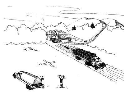 A loaded log truck approached the landing area. The helicopter pilot did not see the oncoming log truck, and the log truck proceeded through the work area apparently not seeing the landing helicopter.