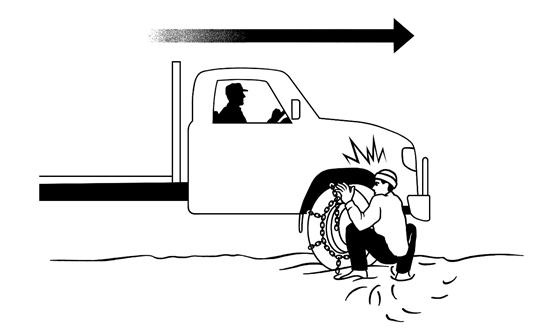 Anytime a second person is involved with installing tire chains (or any similar operation), it is the driver’s responsibility to not only communicate with the assistant but to establish visual contact with the assistant prior to moving the truck. This clearly did not happen in this instance, with fatal consequences.