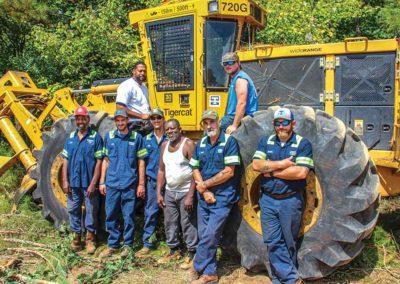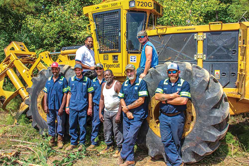Posing in front of one of three 720G feller-bunchers, sitting up top, left to right, Thomas Jones and Bobby Laster; standing, left to right, Leon Curry, Wesley Coleman, Will Coleman, Toisey Coleman, James White, Shane White (not pictured, Ty Hayes).