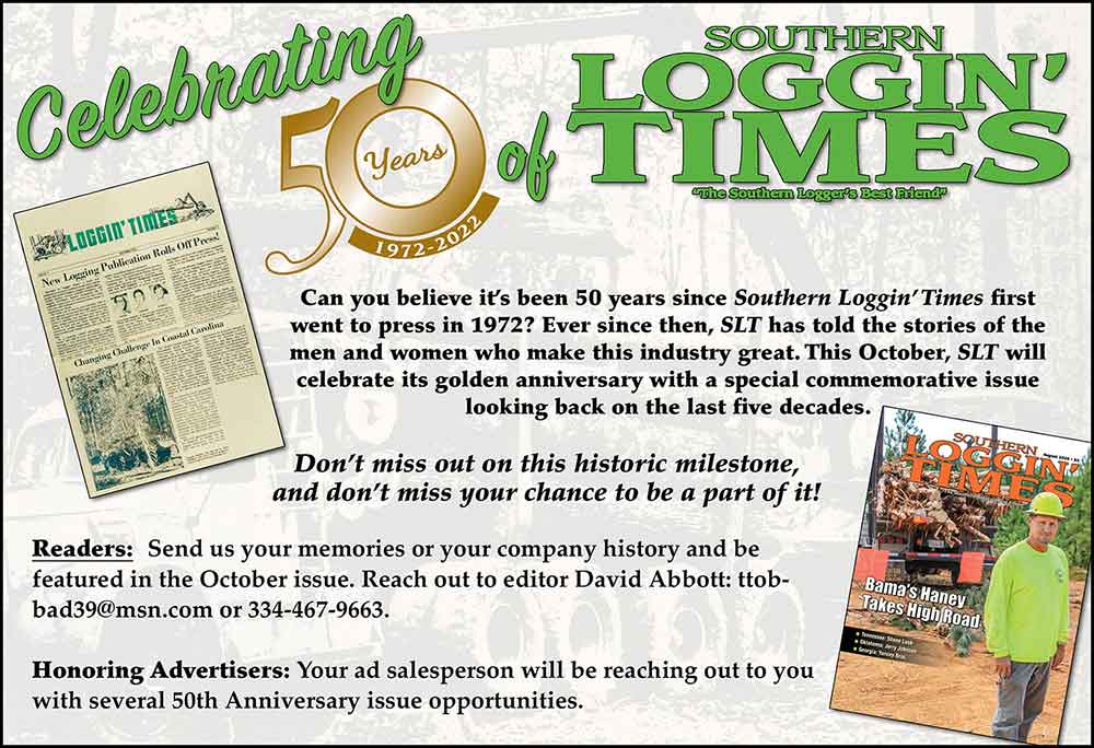 Advertisers: As a thank you to our advertisers for your support, the October issue will offer special promotional opportunities. Your ad salesperson will be reaching out to you with details. And, if you’re not already an advertiser but want to be, reach out to our ad sales team so that you can participate in the commemorative 50th anniversary issue of Southern Loggin’ Times. All ad material must be reserved by September 12, 2022.