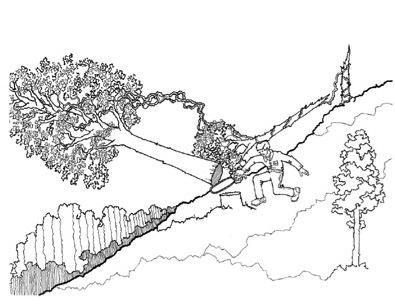 ACCIDENT: As the poplar fell, the grapevine pulled on the small tree, breaking it off at a point nine feet above the ground. The falling poplar and grapevine continued pulling the broken portion of the smaller tree downhill until it struck the feller on the back of the head.